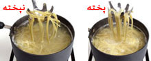 2-پاستای رشته ای: وقتی پاستای رشته ای را با قاشق و یا کفگیر بالا می آورید، بایستی رشته ها بطور آزادانه آویزان گردند.در غیر اینصورت بایستی اندکی بیشتر پخته شوند.